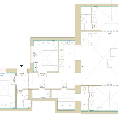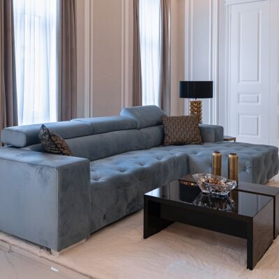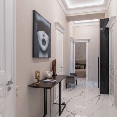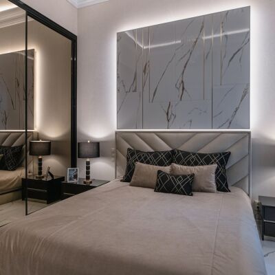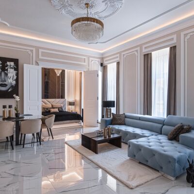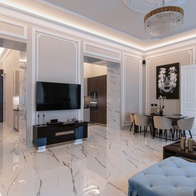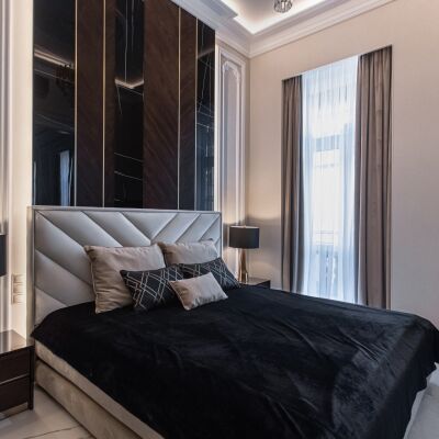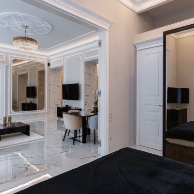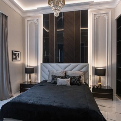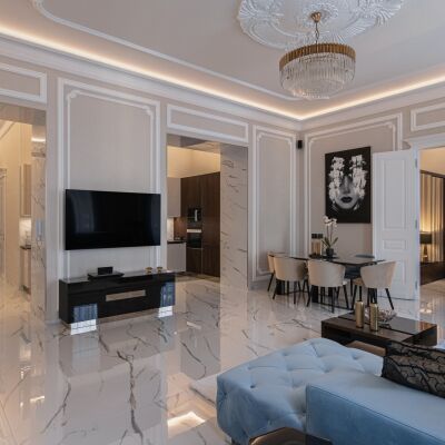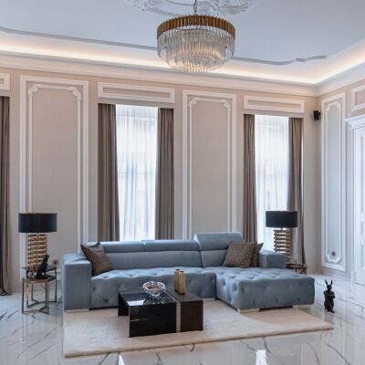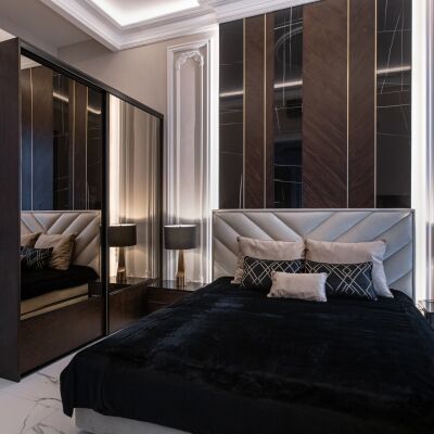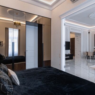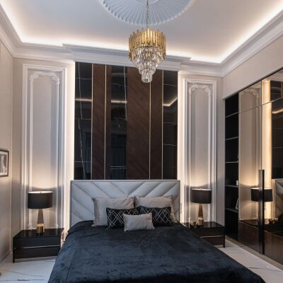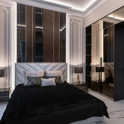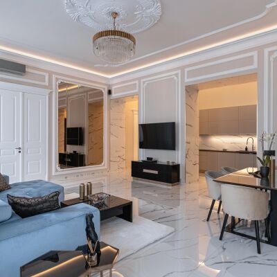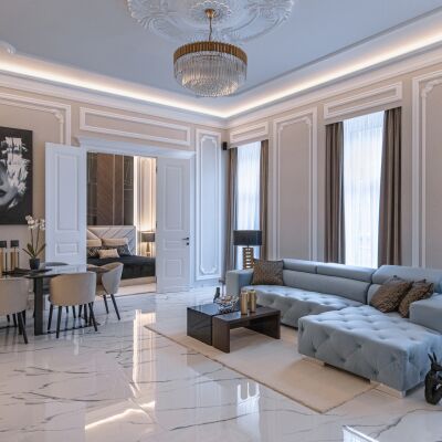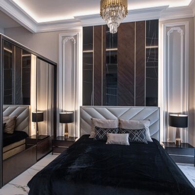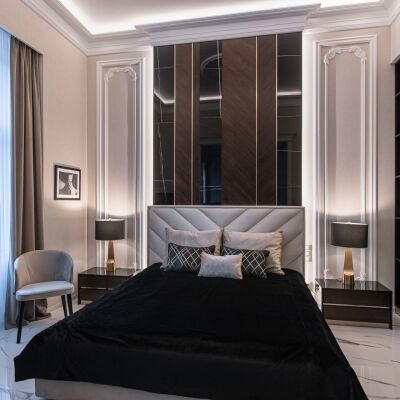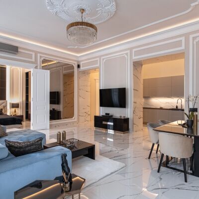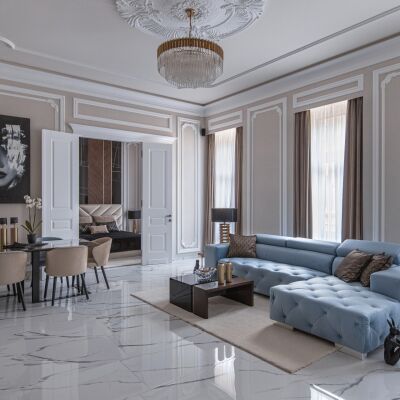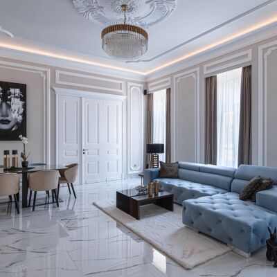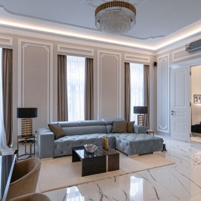 Utilizing the features of the apartment, the four bedrooms with three bathrooms and a huge living room with kitchen and dining room were designed, thus making the space much brighter, more spacious and cozy. The living room and bedrooms are decorated with handcrafted gypsum ceilings and sidewall gypsum stucco. The designers have placed great emphasis on making the most of the space, so that the exclusive pieces of furniture, designed and manufactured individually, provide a lot of loading space.