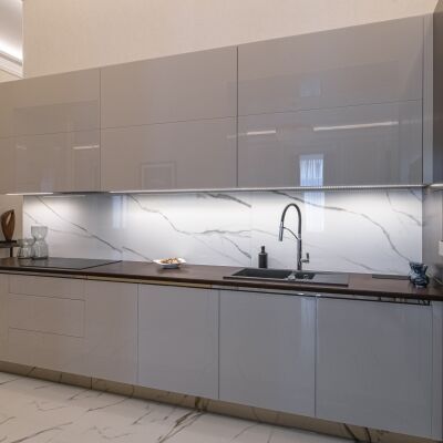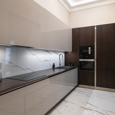 The kitchen is modern, mechanized (Gorenje Oraito) and has several storage options. The furniture features high-gloss fronts and characteristic worktops.