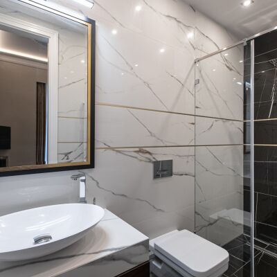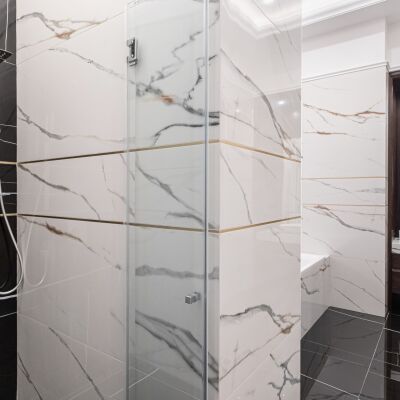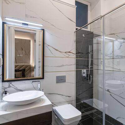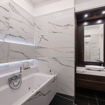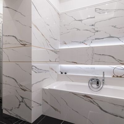 The bathrooms feature high-quality sanitary ware (Grohe, Villeroy & Boch) and Italian design tiles to match the style of the apartment (Marazzi).