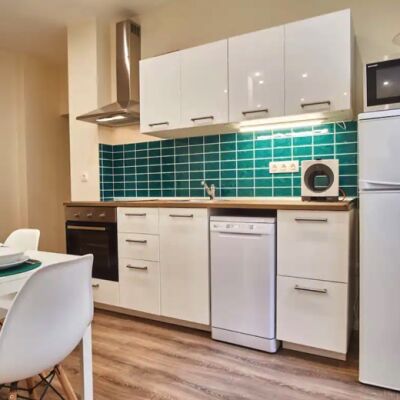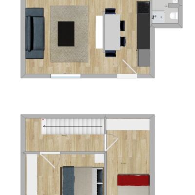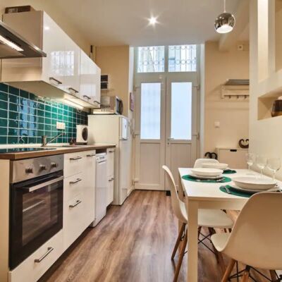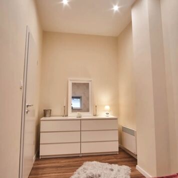 In the heart of the city center, we offer this spacious duplux apartment which has a total of 58 sqm of usable space (30 sqm on the title deed). The kitchen, living room and bathroom are on the main floor, and two bedrooms are up the staircae on the second floor. The layout is perfect for long or short term rentals, and the ceiling height of each level is over 2.5 meters. It is fully equipped with all appliances and ready to move into. The recently renvoated building is on a very quiet street, yet just steps away from dozens of 5th district shops, cafes, and restaurants. The ask price is 198,000 euros.