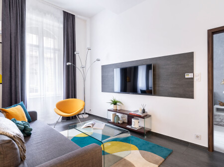 The windows of the tastefully renovated two-bedroom two-bathroom apartment overlook the quiet Kertész Street.