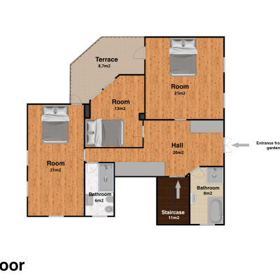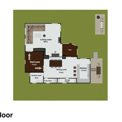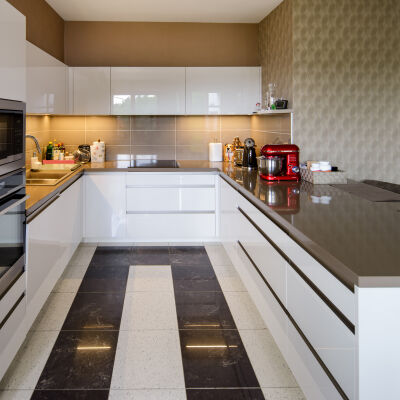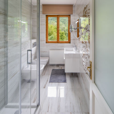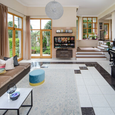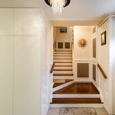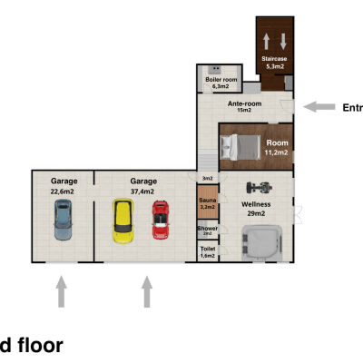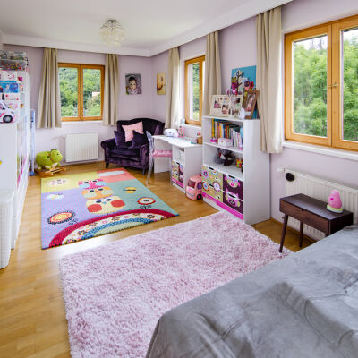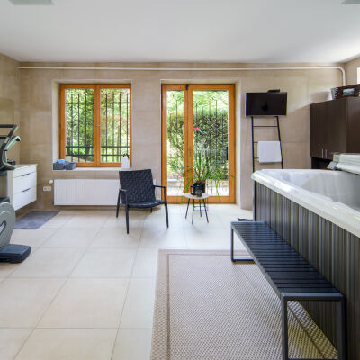 On the lower level there is the already mentioned wellness area with a Finnish sauna and a 6-person Jacuzzi, as well as a guest room, a boiler / storage room and a comfortable garage for 3 cars. The security of the house is ensured by the alarm and camera system.