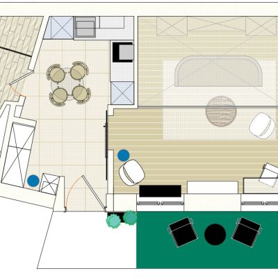A private green terrace in front of the apartment provides the ideal setting for morning coffee or a relaxing evening.