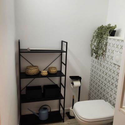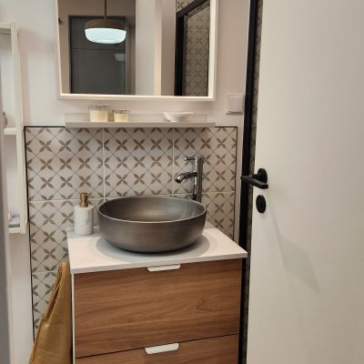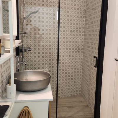 Bathroom: Spacious with elegant tiles and a comfortable shower