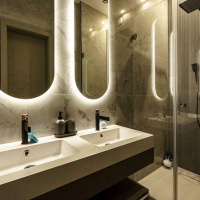 Fully renovated with premium materials, it offers a bright open-plan living room with a decorative fireplace, two bedrooms each with en-suite bathrooms, and a small balcony.