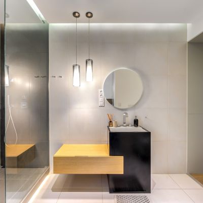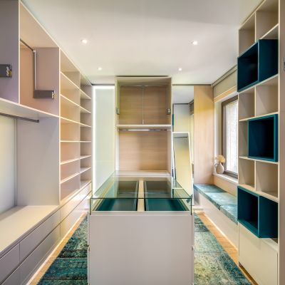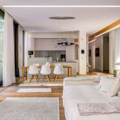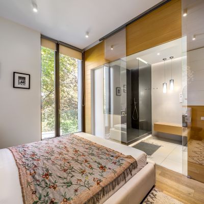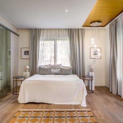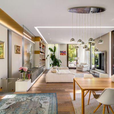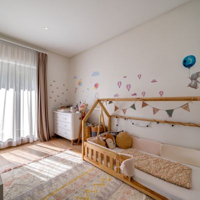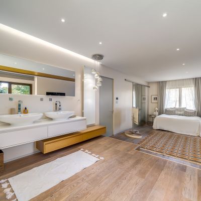 The 240 m² living space features a spacious living room and three bedrooms, each with its own private bathroom, ensuring full comfort and independence for every family member.