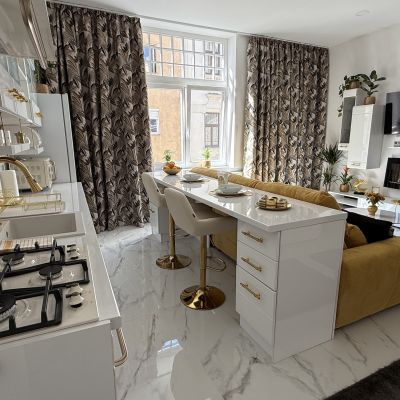 The property offers a bright, southwest-facing layout comprising an open-plan living room with a fully fitted kitchen and a double bedroom, both with street-facing windows. Though compact in size, the apartment has been cleverly designed to feel spacious and comfortable.
