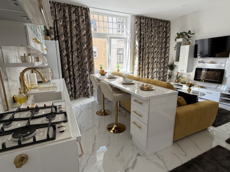 The property offers a bright, southwest-facing layout comprising an open-plan living room with a fully fitted kitchen and a double bedroom, both with street-facing windows. Though compact in size, the apartment has been cleverly designed to feel spacious and comfortable.