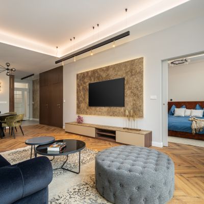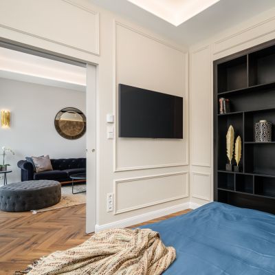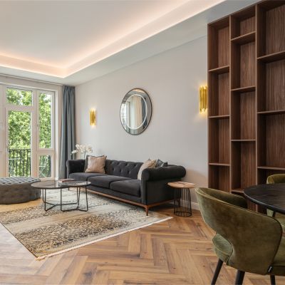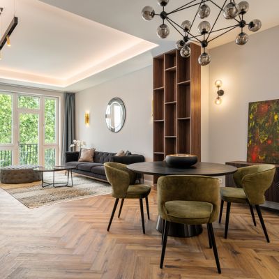 Set within a distinguished early-20th-century building with lift access in Lipótváros, the residence has been completely rebuilt to an impeccable standard following a two-year renovation designed by Haken Design Studio (Kriszta Kováts). The result is a luxurious home that blends timeless elegance with state-of-the-art modern comforts.