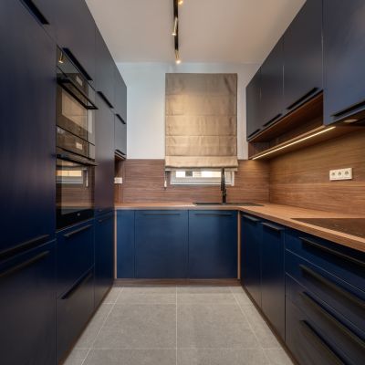Every detail of the interior reflects exceptional quality. Premium multi-layer German aluminium–wood windows provide outstanding insulation, while individually controlled underfloor heating and ceiling cooling ensure year-round comfort. Silent magnetic doors, bespoke hand-painted wall finishes and custom-crafted furniture fronts, created by a visual artist, elevate the aesthetic throughout. The fully fitted kitchen, finished in an Ocean Blue tone and equipped with AEG appliances, forms a stylish focal point within the bright, open-plan living space.