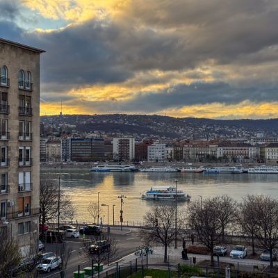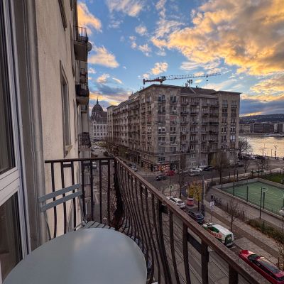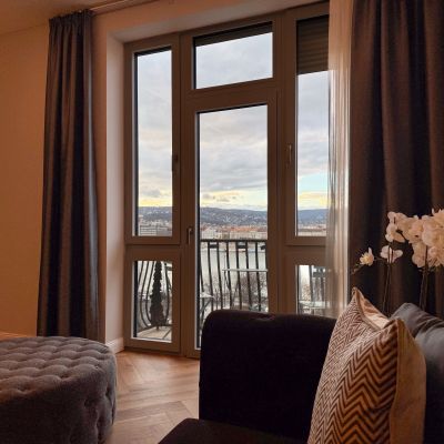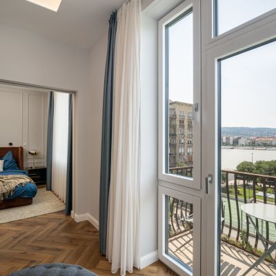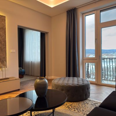The apartment offers one of Budapest’s most exceptional panoramas, with sweeping, uninterrupted views of the Danube, the Parliament and the Buda Hills extending all the way to Margaret Bridge. This remarkable outlook can be enjoyed both from the elegant living area and from the private balcony, creating a truly rare setting in the heart of the city.