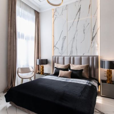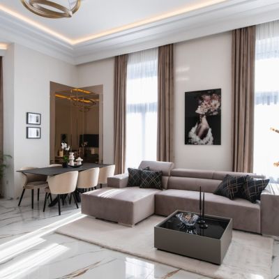 The excellent layout of the property has been thoughtfully utilized to create two bedrooms and two bathrooms, as well as a spacious open-plan living room with kitchen and dining area, resulting in a bright, elegant, and inviting living space. Custom-designed and individually manufactured plaster ceilings in the living room and bedrooms reflect meticulous craftsmanship and enhance the apartment’s exclusive character. Special attention was paid to functionality during the design process, with bespoke, high-end furniture pieces providing generous storage solutions while maintaining a refined aesthetic.
