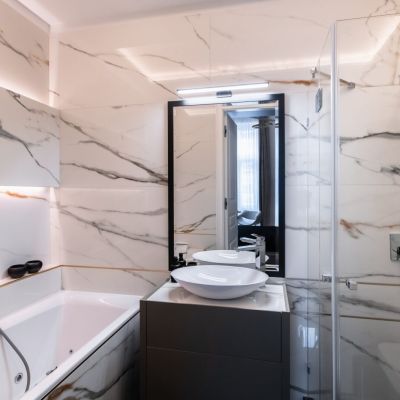 Both bathrooms are fitted with premium-quality sanitary ware (Grohe, Villeroy & Boch) and elegant Italian design tiles (Marazzi) that perfectly complement the overall style of the apartment. Smart TVs, a 5.1 home cinema system, and air conditioning units have been installed in the living room and bedrooms to ensure maximum comfort. The contemporary, sophisticated ambiance of the property is completed by decorative elements from renowned design brands such as Kare, BoConcept, and Einholtz.