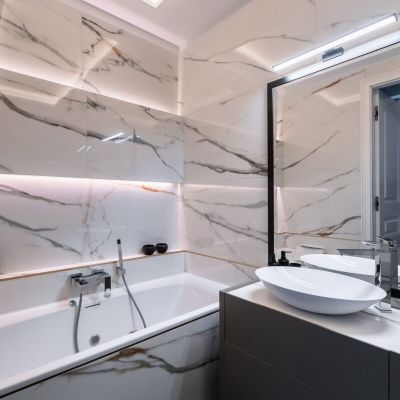 A standout feature of the living area is the impressive bronze mirror, uniquely finished with faceted edges on all sides, creating a striking visual effect and adding depth to the space. The modern, fully equipped kitchen (Gorenje Ora Ito) offers ample storage and is defined by high-gloss cabinetry and distinctive worktops. A built-in white onyx bar counter serves as a true focal point, and when illuminated, it further elevates the atmosphere of the interior.