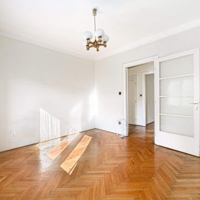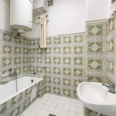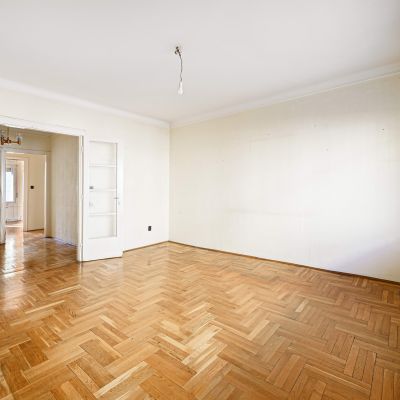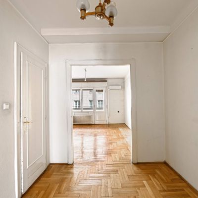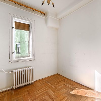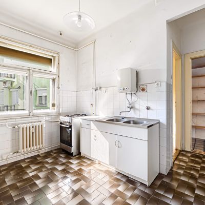The apartment is in need of renovation, offering excellent potential. All internal walls are movable, allowing for a highly flexible layout. Every room, including the kitchen, benefits from natural light. The two bedrooms and the kitchen face south, while the living room faces north.