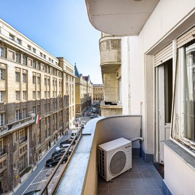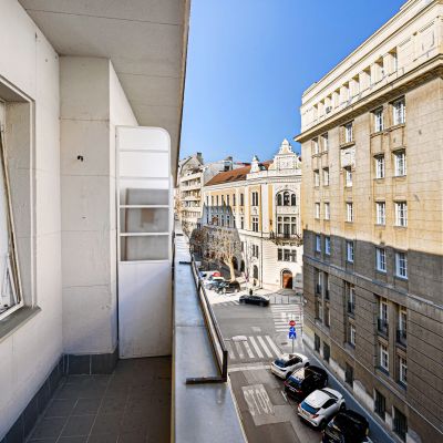 The location is exceptionally central, with Kossuth Square just 100 metres away and Liberty Square approximately 500 metres from the property. Despite its city-centre position, the apartment is remarkably quiet, as the street is one-way only.