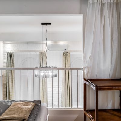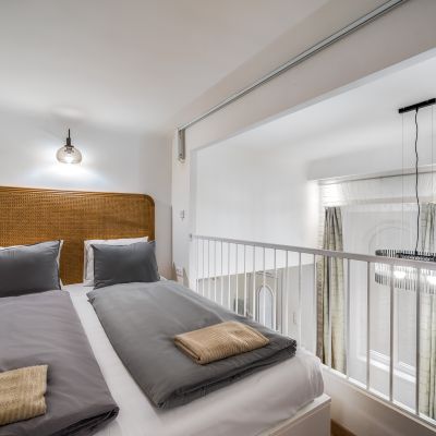 The two apartments are registered as 56 sqm on the title deed, as the two mezzanine levels, adding a total of 24 sqm, were constructed later. These mezzanines are fully functional, built with iron structures, and offer a ceiling height of 2 metres, allowing you to stand comfortably.