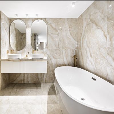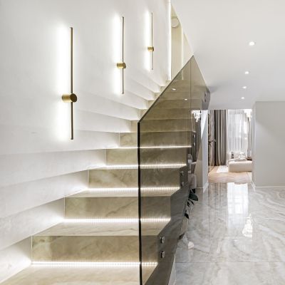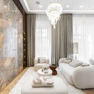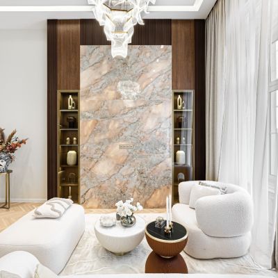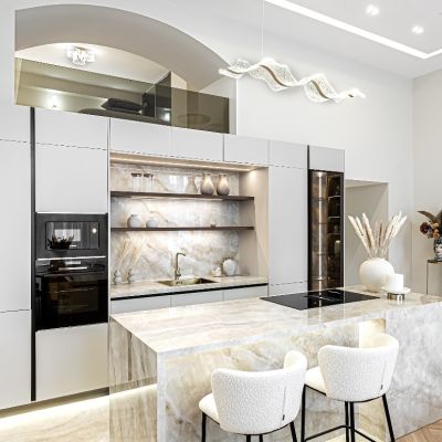 An open-plan American-style kitchen completes the home, centered around a striking onyx kitchen island that adds a refined, modern touch. Fully equipped and thoughtfully designed, it blends style with practicality.