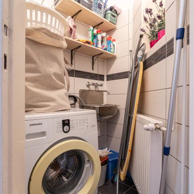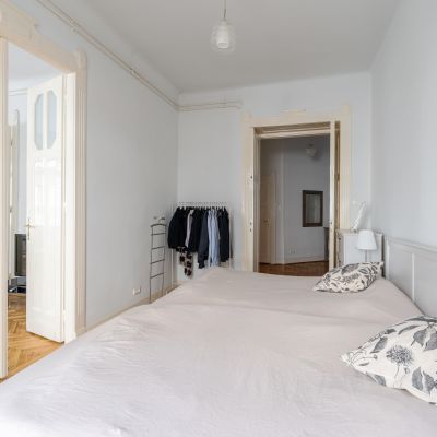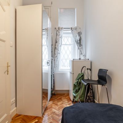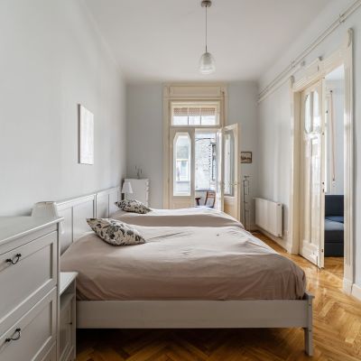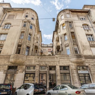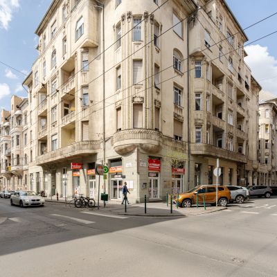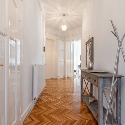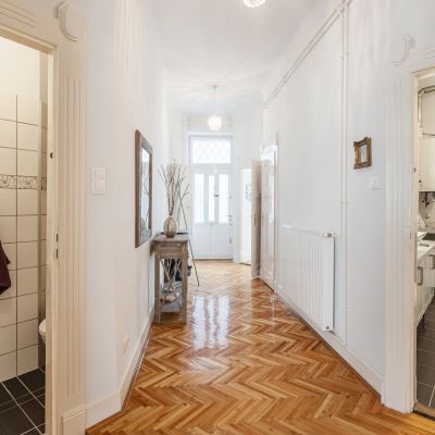 The flat has preserved its classic charm, highlighted by the original parquet flooring and elegant double-leaf doors. Thanks to the large street-facing windows, the apartment is bright and filled with natural light, while the spacious rooms provide a comfortable living environment.