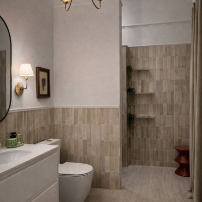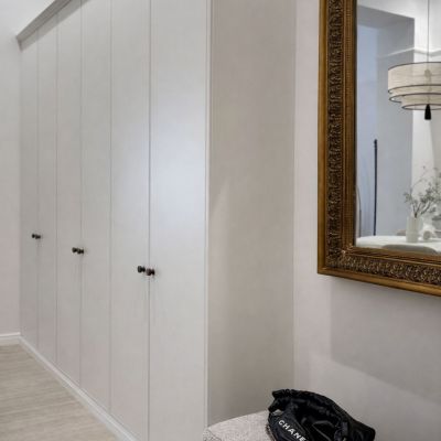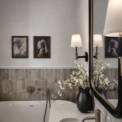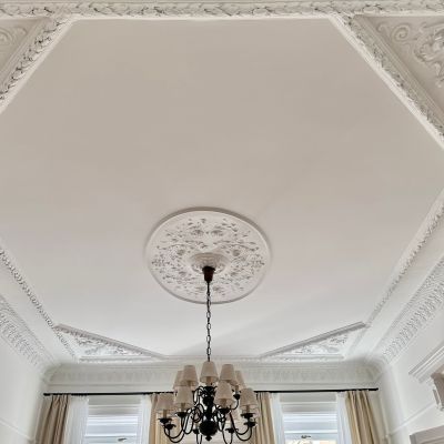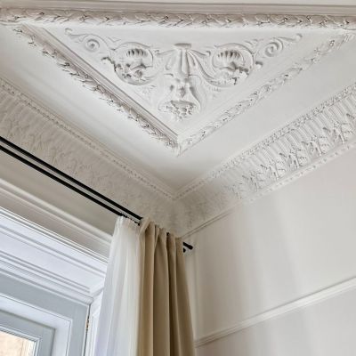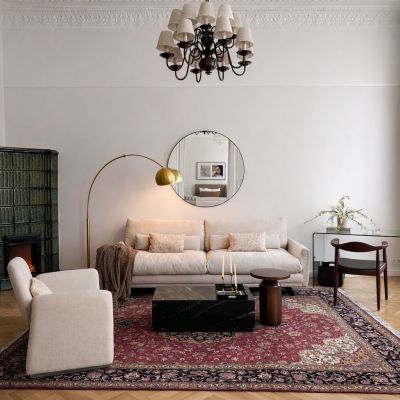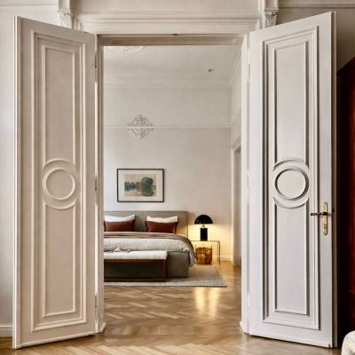 The apartment extends across two bedrooms and two bathrooms, with four-metre ceilings lending the principal reception rooms a pronounced sense of grandeur and light. Throughout, new herringbone parquet flooring has been laid, complementing a series of carefully preserved period features: original 19th-century stucco work in the living room, elegant French double doors, and restored window shutters. The signature centrepiece of the property is a preserved antique tiled stove, discreetly enhanced with a built-in electric fireplace to create a warm and distinguished focal point.