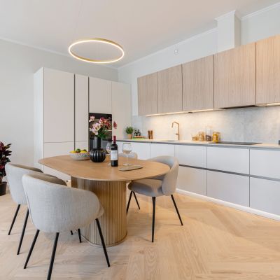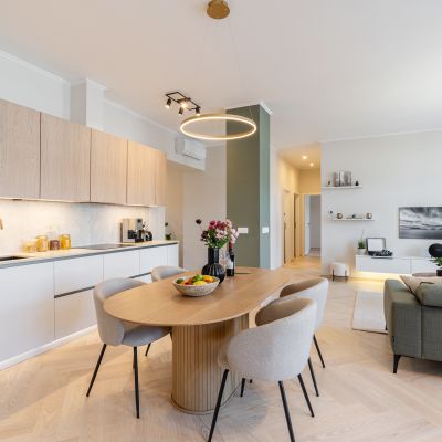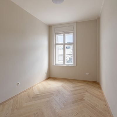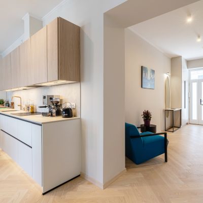The finishes and built-in elements are also of high standard: 14 mm herringbone wooden flooring in the living areas, a custom kitchen with a stone countertop, quality interior doors, and refurbished original windows with double glazing.