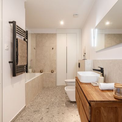The property has undergone a complete, high-quality renovation, covering both technical and aesthetic aspects. Comfort is ensured by underfloor heating in almost all rooms, except for the living room, where modern ceiling heating is installed. A private gas boiler, air conditioning in every room, and excellent sound insulation all contribute to everyday comfort.