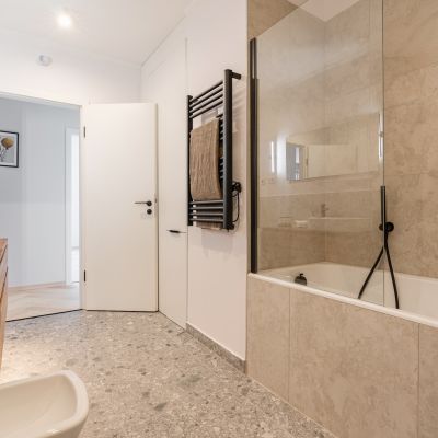 The apartment features three separate bedrooms, one of which has its own bathroom and walk-in wardrobe, providing a comfortable and well-separated private area. In addition, there is a second bathroom and a separate guest toilet.